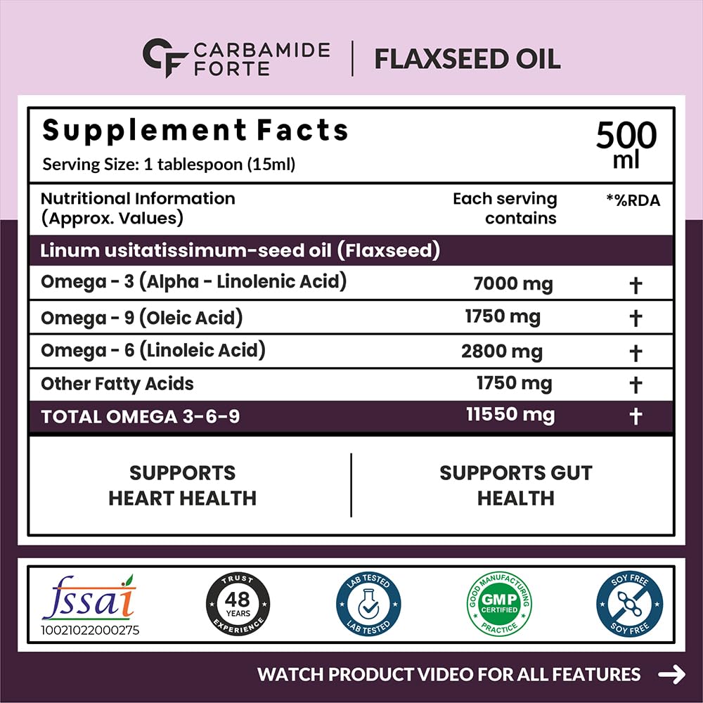 Carbamide Forte Cold Pressed Flaxseed Oil 500ml with 11500mg Omega 3 6 9 per Serving for Eating, Skin & Hair Growth – Vegetarian Oil