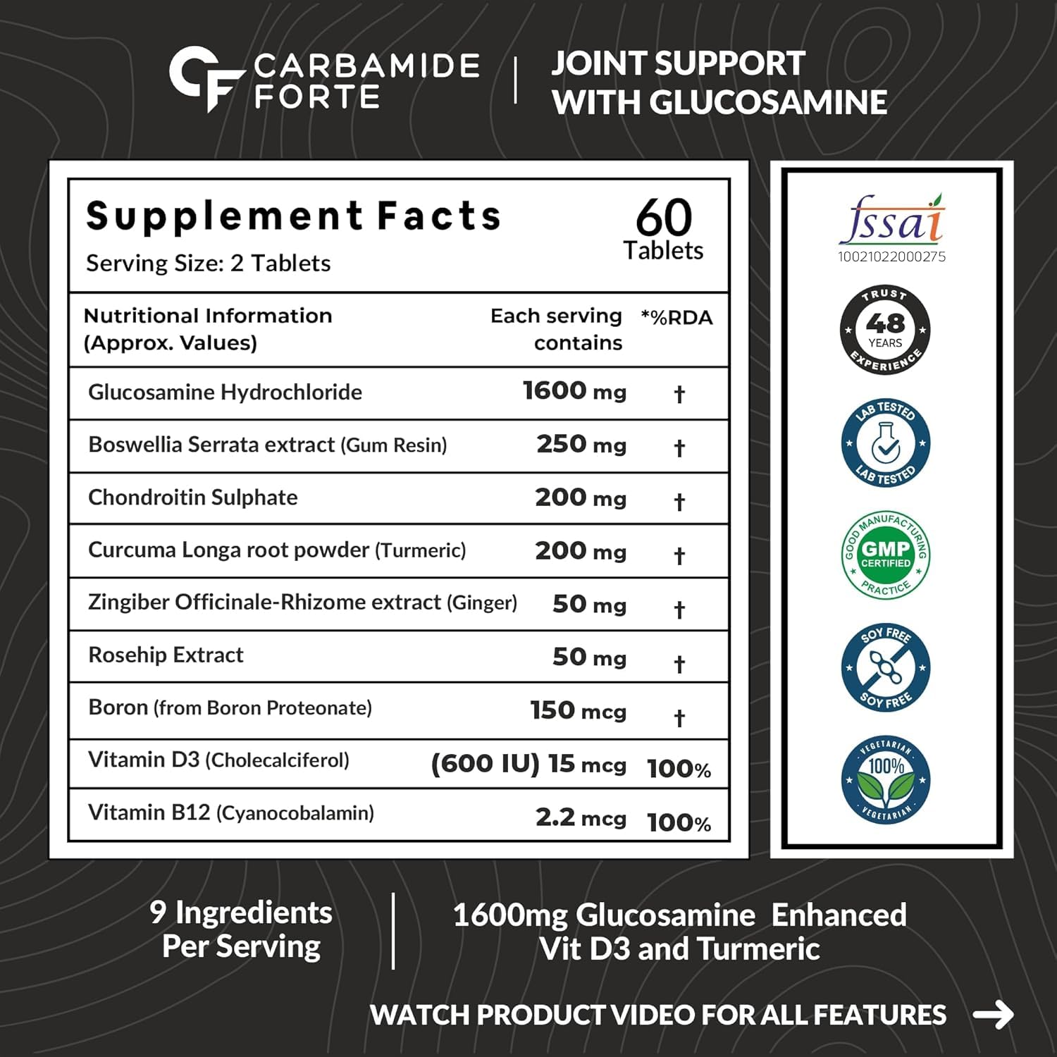 Carbamide Forte Joint Support Supplement with Glucosamine 1600mg Per Serving with Chondroitin, Boswellia, Turmeric & Ginger- 60 Tablets, 180 Grams