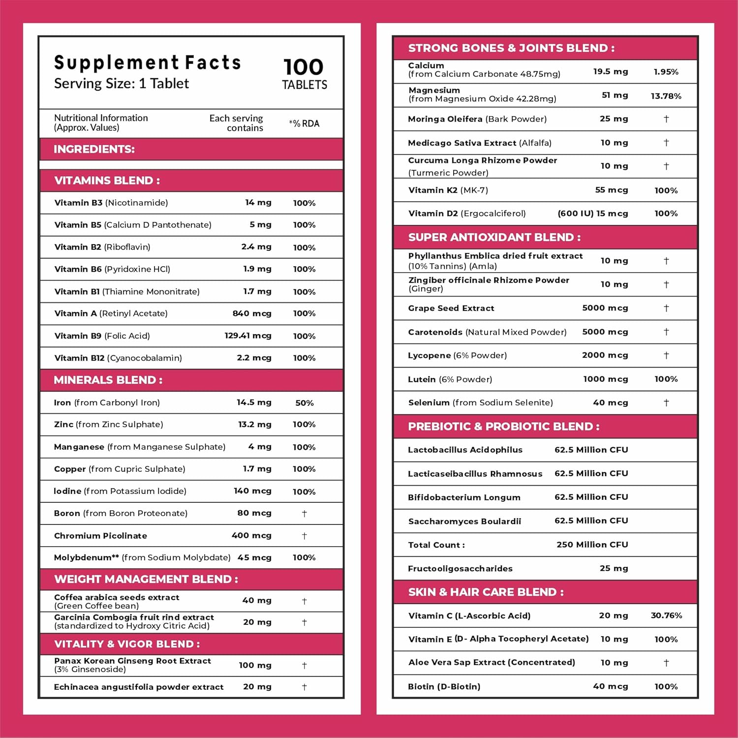 - πππ% π₯ππ π’π π π¨ππ§ππ©ππ§ππ ππ‘π¦ & π π¨ππ§π π ππ‘ππ₯πππ¦ : These women multivitamin supplement with zinc covers your complete dietary requirements by giving 100% RDA of most of the Essential Vitamins & Minerals.