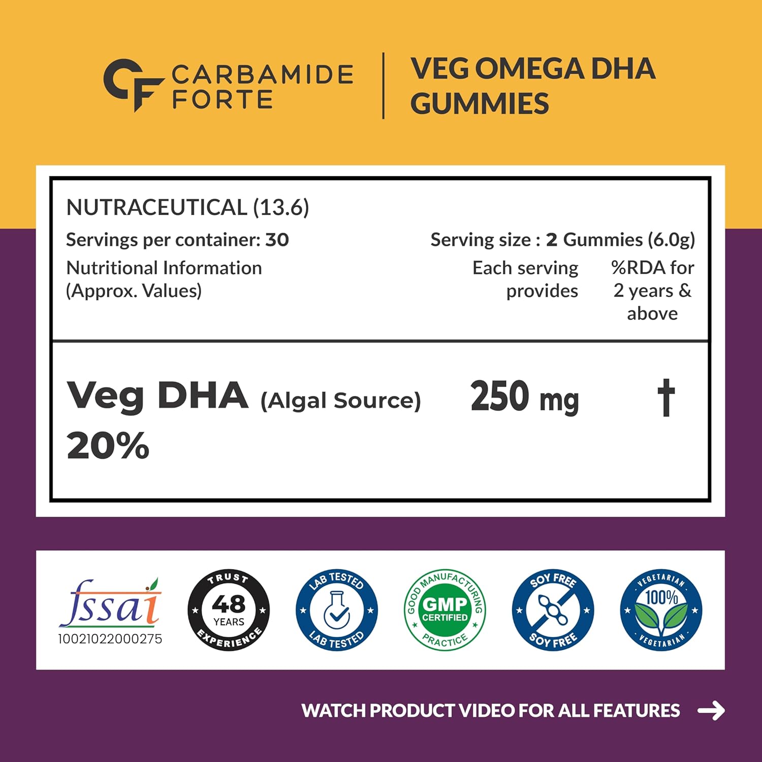Carbamide Forte Veg Omega3 DHA 250mg – Gummies for Men, Women & Kids with Vegetarian DHA | No Fish oil Used | Omega Veg DHA Gummies | Healthy Heart, Brain & Joints – 60 Veg Gummies